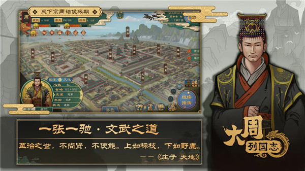 大周列国志最大的亮点之一就是引入了诸子百家了,儒、法、兵等九大文化流派可以不同的方面给予玩家帮助,不同流派还可以为玩家提供超过一百组的国政改革措施,让玩家可以自由选择践行政治理念和发展之路。