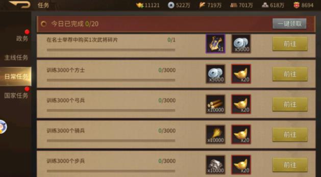 国家任务是国家内所有玩家共同推进的任务,任务可获得大量元宝和功勋。功勋可用于提升爵位,后续的爵位详解中会进一步进行说明~~