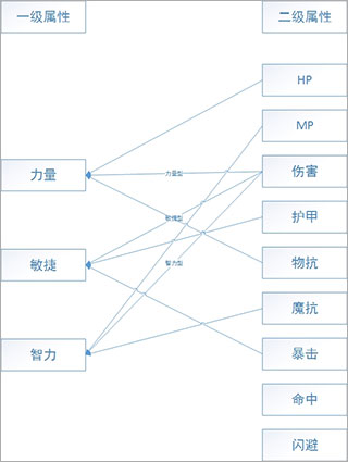 如图所示,主公的一级属性为力量、敏捷、智力。对应的,力量影响HP,力量型主公(曹操)的伤害,以及物抗;敏捷影响护甲,敏捷型主公(孙权)的伤害,以及暴击;智力影响MP,智力型主公(刘备)的伤害,以及魔抗。而命中和闪避需要通过装备来提升。
