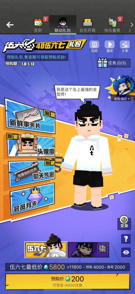 礼包内容:4D伍六七皮肤、伍六七专属头像框、伍六七新鲜事卡片、伍六七聊天气泡、会员30天;