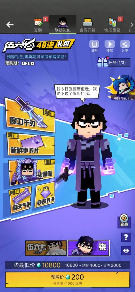 礼包内容:4D柒皮肤、魔刀千刃、柒头像框、柒新鲜事卡片、柒聊天气泡、会员30天;