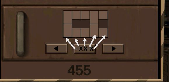 1. 密码箱门的方框内有五列,它与中间按钮上“-××-×”的图形相互对应。这里的“×”代表方块,“-”代表空白,也就是说,需把方框里的五个列调整成“—■■—■”这样的排列形式,才能将柜门打开。