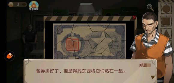清晨前往餐厅准备享用早餐,首先要将狱警给的那张被撕碎的餐券拼接起来,接着从餐桌上取来胶水把它粘好。