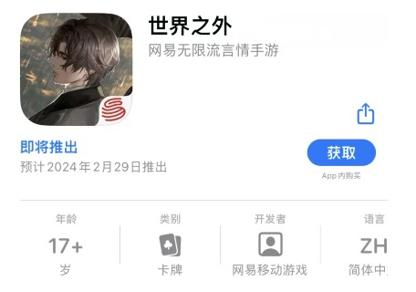 网易首款无限流言情《世界之外》IOS预定开启,占位符显示2月29日上线。