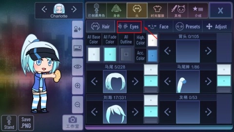 2、随后点击“Eyes”眼睛选项,着手挑选角色的眼睛;
