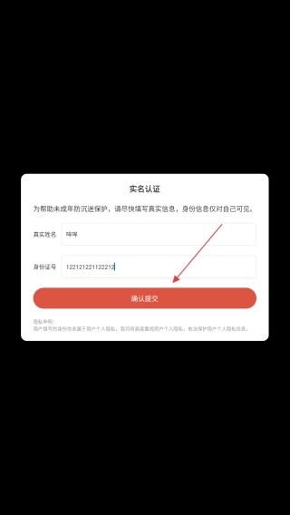 3、确认输入信息无误后,点击【确认提交】按钮,完成实名认证,即可开始游戏。