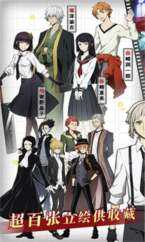 怀有文豪之名的游戏角色集结,无论是号称横滨F4的中岛敦、太宰治、芥川龙之介、中原中也,还是两大组织的头目福泽谕吉、森鸥外,还有泉镜花、江户川乱步、织田作之助、坂口安吾、费奥多尔等各种人气角色,你都有可能召集他们,成为队伍中的一员。