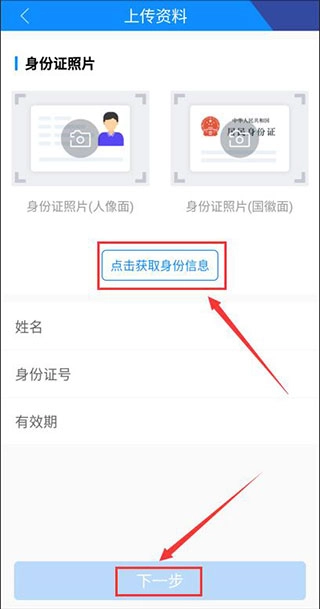 5、最后一步就是上传我们的身份证照片了,上传完成后可以点击下方的获取身份信息按钮而无需手动输入,然后点击下一步完成注册。