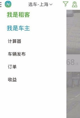 4、点击主页左上角“三”图标,或主页屏幕从左往右滑动,进入“我是车主”、“我是租客”、“个人中心”界面。注:“个人中心”界面需点击账户头像进入。