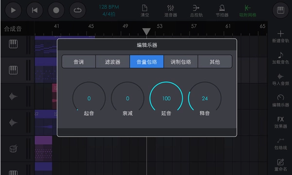 关于包络,所有乐器音色都是相同的,四个参数代表了你按下键盘上的音开始到你松开音直至音完全消失的整个阶段:起音(Attack)、衰减(Decay) 、延音(Sustain)和释音