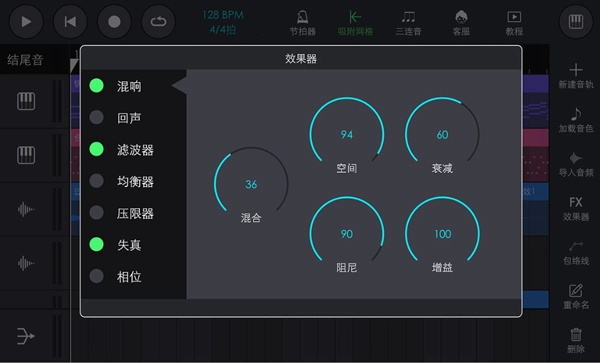 如果要使用某一个效果器,请先将该效果器左侧的圆形点亮,否则效果器无效果!"混合"旋钮可调节所谓"干/湿音"的比例,干音即未经处理的原音频,湿音即处理后的音频。