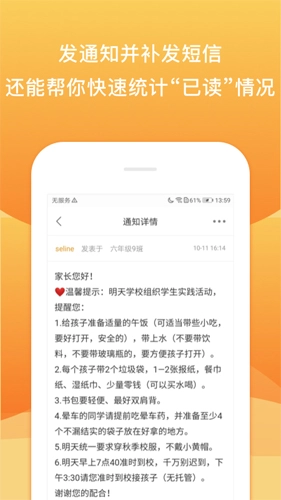 免费短信通知/作业:老师在网页端或手机端发送通知,无需昂贵的流量费,直接短信接收