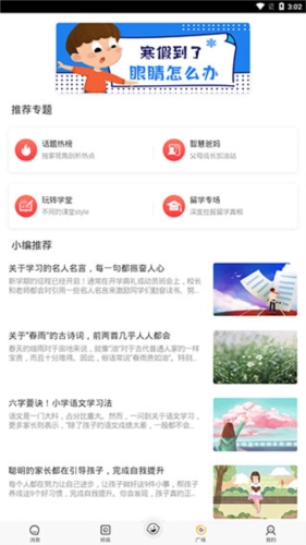 5、【广场】:这里显示的是软件的专题页,其中包含了话题热榜、智慧爸妈、玩转学堂、留学专场以及小编推荐等多个板块。
