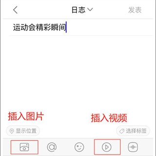 4、编辑日志内容,选择想要上传的图片/视频后,点击【发表】即可。