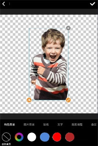 4、可以自主挑选图片背景、贴纸、文字,还能进行抠图调整、叠加等操作,编辑好之后点击“√”,再选择保存就完成了。
