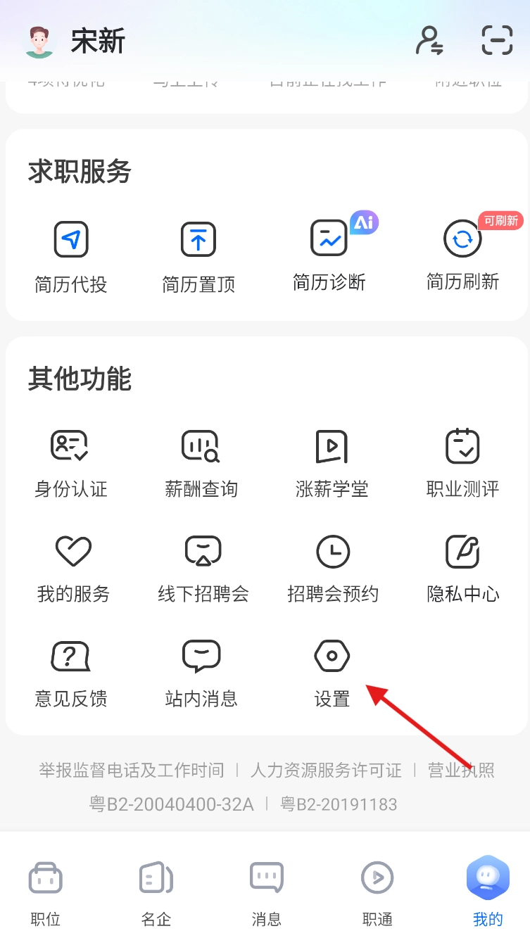 2、跳转至 “我的” 页面后,目光下移找到并点击位于下方的 “设置” 按钮。
