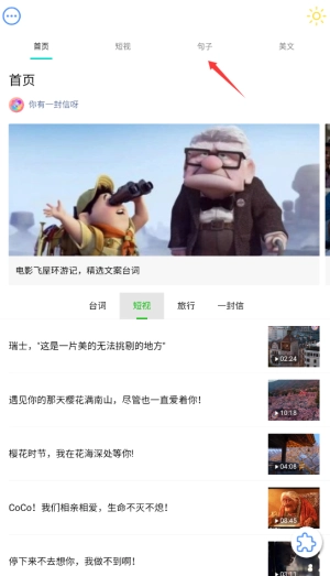 1、启动微励志后,在首页导航栏选择"句子"板块,这里汇集了各类影视金句。