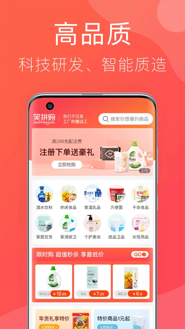 笑拼购是一款手机购物应用,它能为用户提供一体化系统服务,支持在全国范围内销售多家品牌的商品。用户在线购买时可参与丰富的优惠折扣活动,领取大额优惠券,让购物变得更省心省力。