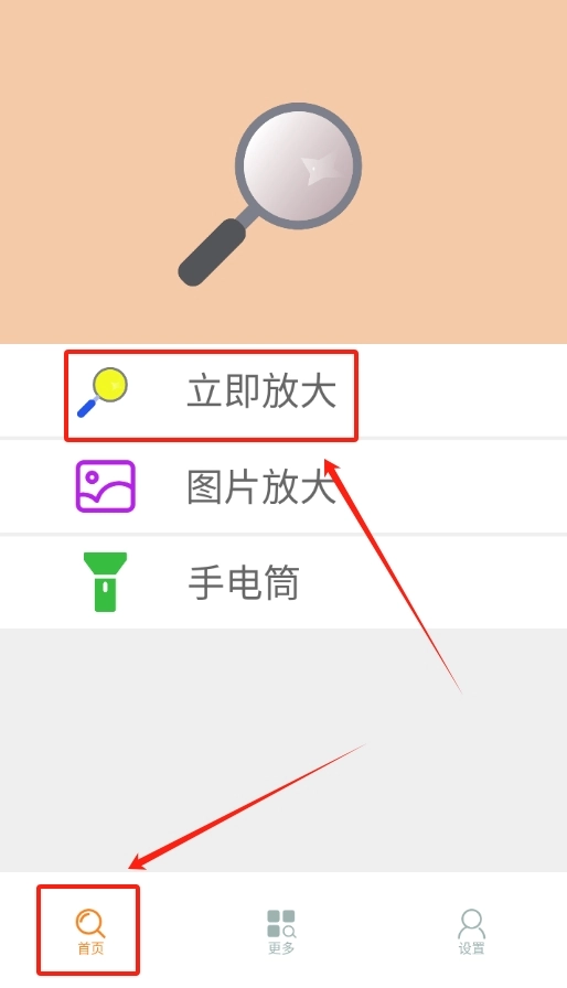 1、打开明目放大镜软件,首页能看到三个功能,分别是立即放大、图片放大和手电筒。