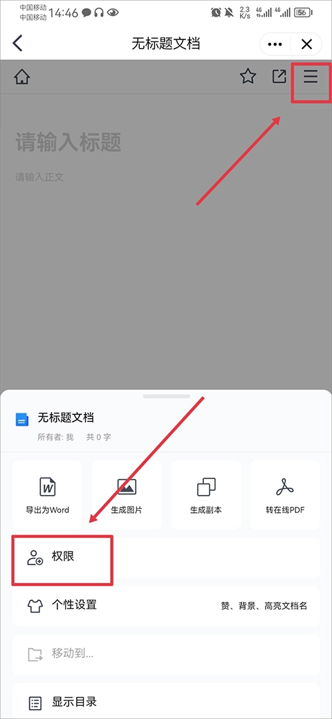 5、文档内容编辑完成后,点击右上角的三条横线图标,接着选择权限选项。