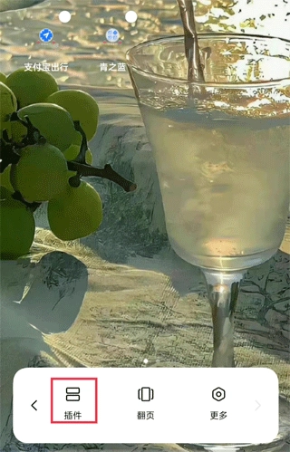 1、在手机主屏幕上用两根手指同时向内捏合,屏幕会弹出各类功能选项,从中找到“插件”这一选项。