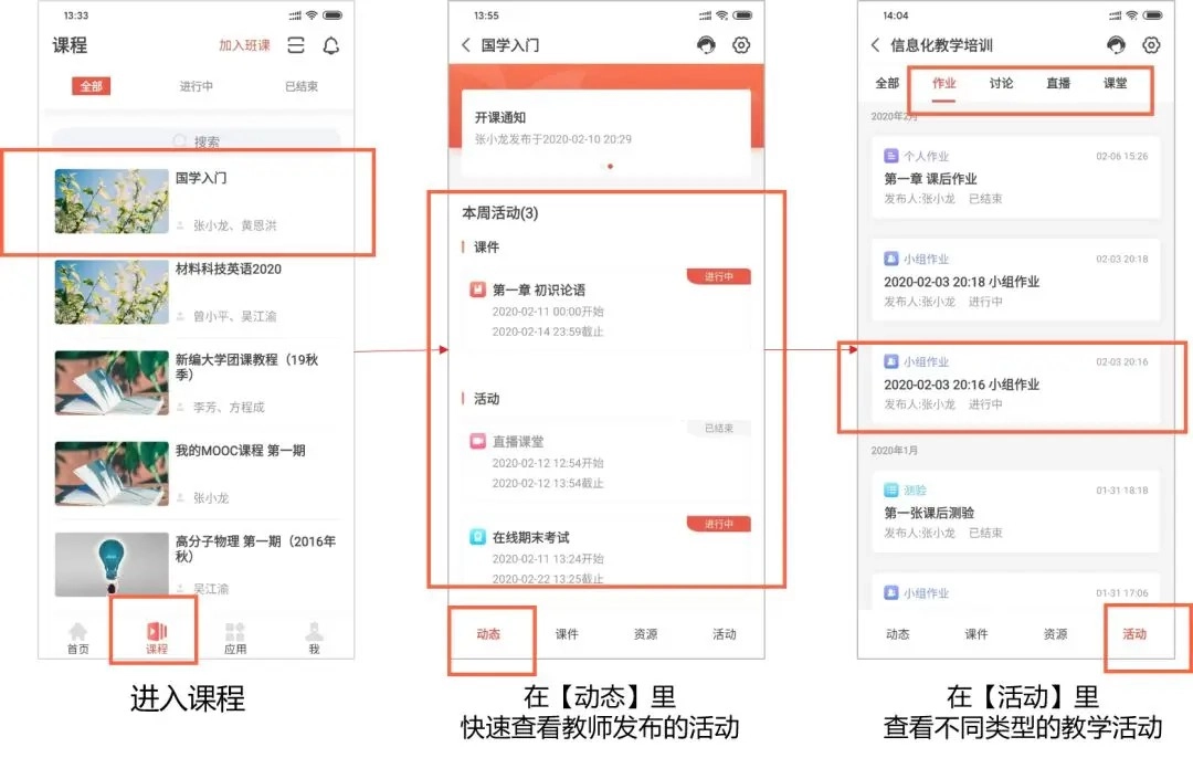 端支持讨论话题。进入课程后,点击【动态】/【活动】板块都可以查看老师发布的讨论话题,点击具体的话题即可参与讨论。