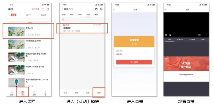 端支持观看直播。进入课程后,点击【活动】板块,选择对应的直播,再点击【进入直播】,即可观看直播。