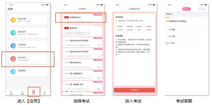 端支持参加考试。进入课程后,点击【应用】板块,选择对应的考试,点击【开始考试】,即可开始答题。