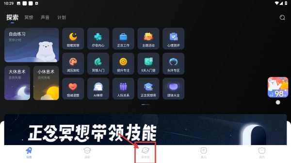 3、在社区探索区,点击早安冥想板块,查看冥想课程及相关内容。