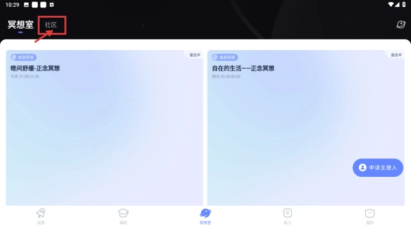 2、在冥想室页面,点击顶部社区选项,进入社区板块。