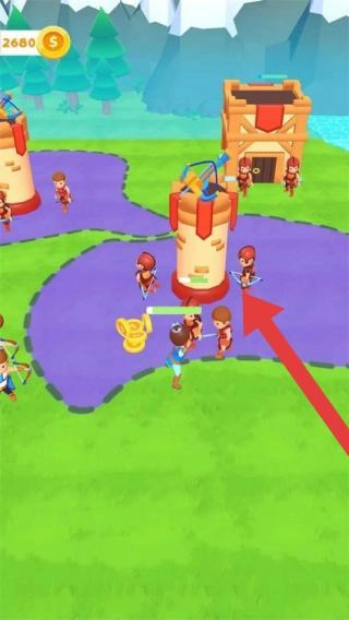 2、画面里能看到士兵和城堡塔楼,左上角标注着当前拥有2680美元,红色箭头所指的位置,看起来是士兵在塔楼附近展开战斗的场景。