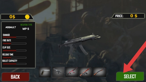 2、所展示的武器为“MP5”冲锋枪,其武器类型归为“ASSAULT”,具备“DAMAGE(伤害)”“FIRERATE(射速)”等属性及对应的价格信息,界面下方设有武器列表以及“SELECT(选择)”“BACK(返回)”按钮。