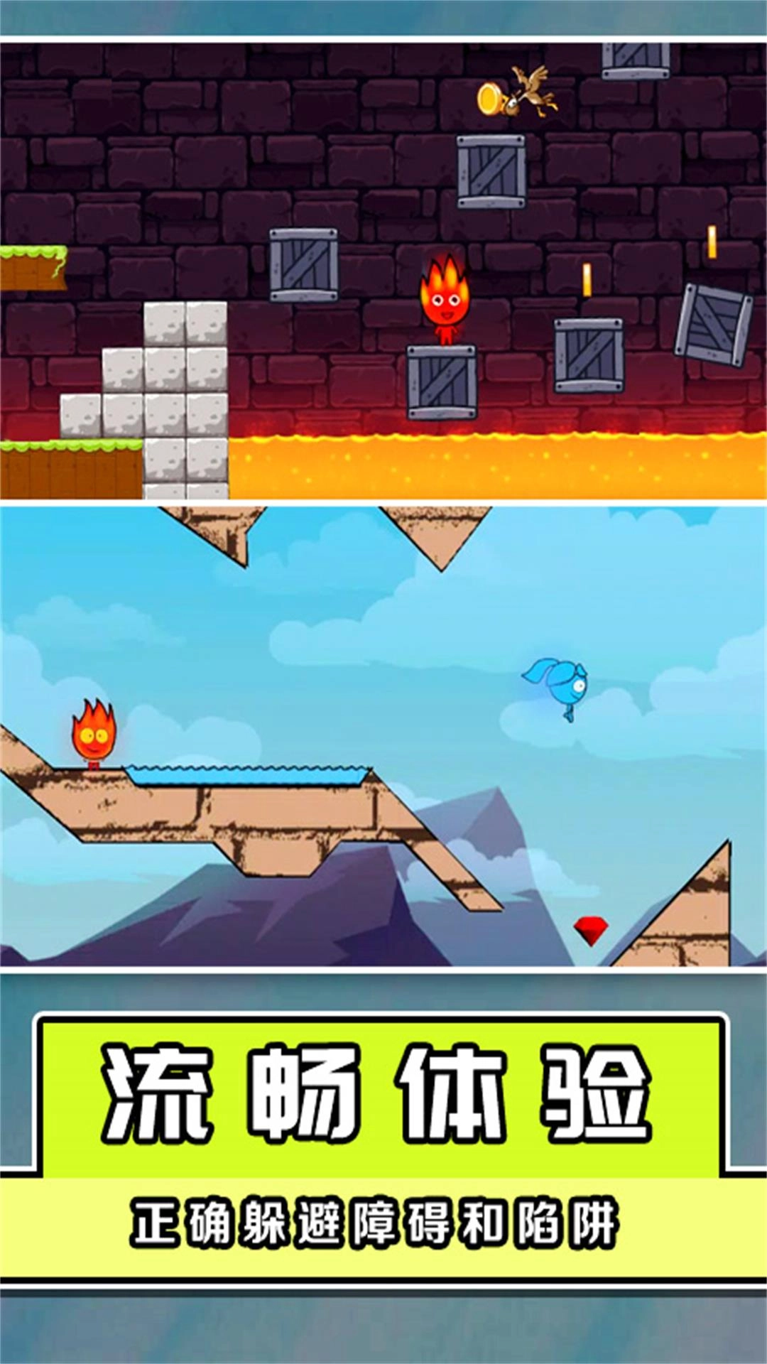 1、灵活指尖微操,可以操控冰火人,跳过悬崖,躲避悬崖下敌人;