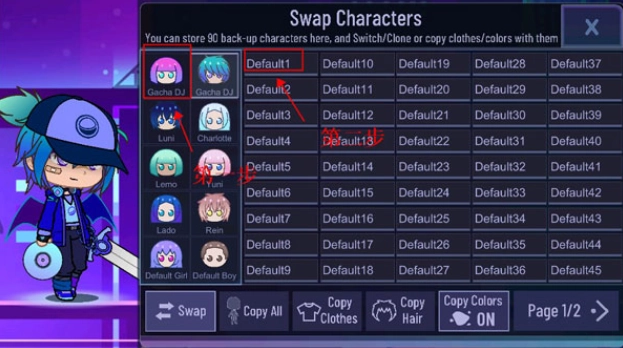 接着来到人物备份界面后,左侧为我们当前已创建角色,右侧为角色备份区域,如果我们要复制某个角色的话,首先在左侧选中想要复制的角色后,再点击右侧备份区域中的某个Default选项,来将我们的角色备份至备份中