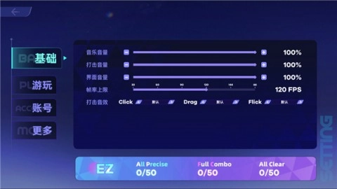 4、玩家可对音乐音量、帧率上限以及打击音效等设置进行调整;