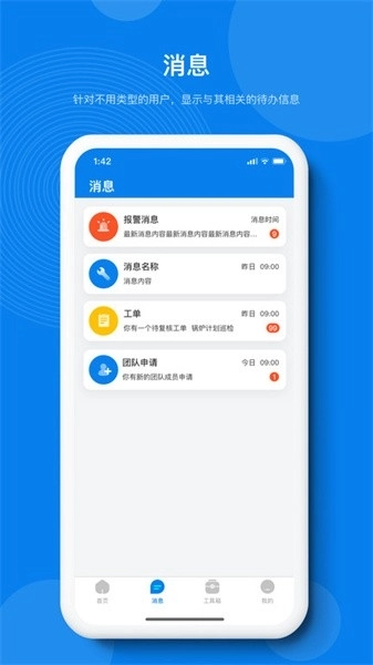 【待办任务说明】报警、工单与设备维护类任务,将通过应用内消息或免费短信推送通知,让您可随时掌握任务动态;各类任务会按类别分类呈现,处理状态清晰可见,无需费心记忆。