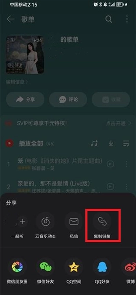 3、如打开网易云或是其他音乐,选择歌单,点击分享,进行复制链接
