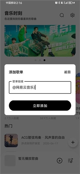 2、会弹出一个添加歌单的弹窗,输入歌单链接即可