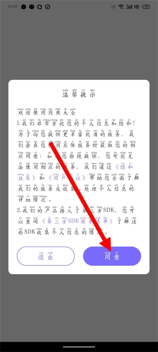 1、打开中国药典,在温馨提示弹窗中点击同意。