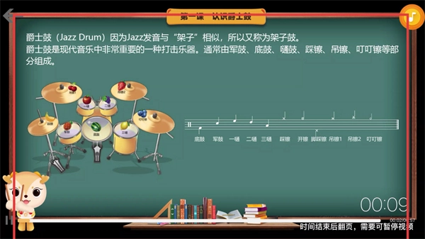 4、在课件学习页面,用户能够观看爵士鼓相关知识的教学视频。